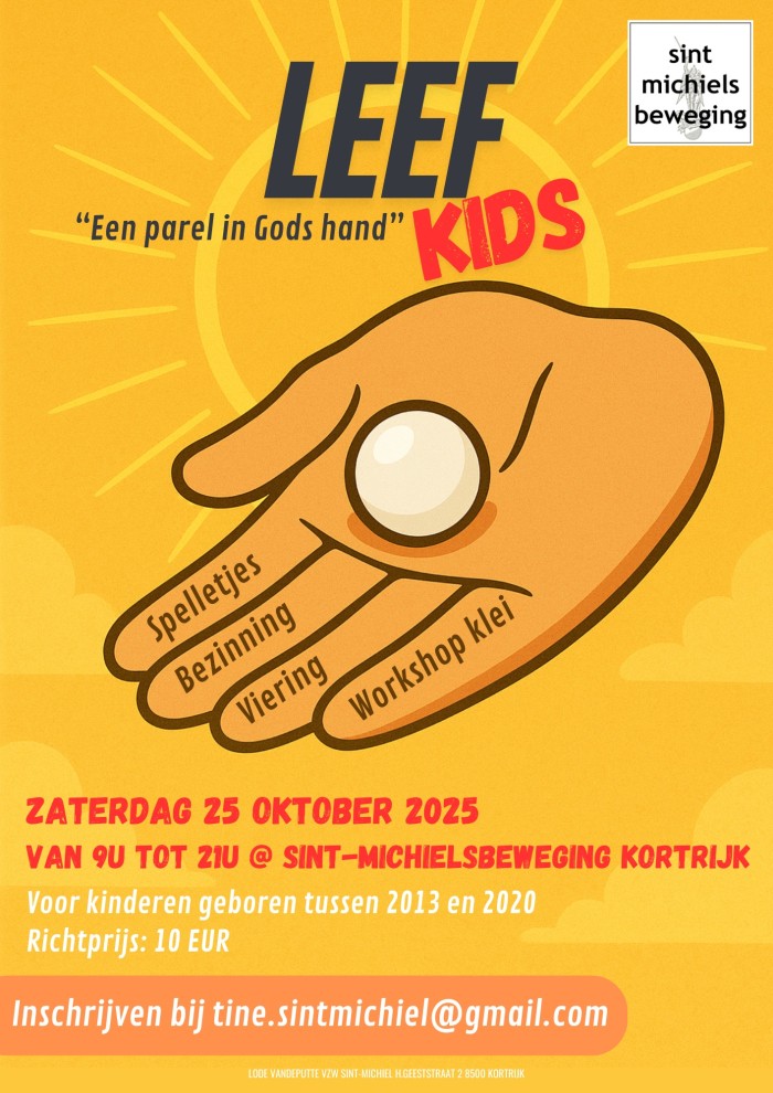 LEEF-Kids Belevingsdag in Kortrijk zaterdag 25 oktober 2025 van 09:00 uur tot 20:00 uur OverSprekersAanmelden Richtprijs EUR 10 Inschrijven en Info: tine.sintmichiel@gmail.com