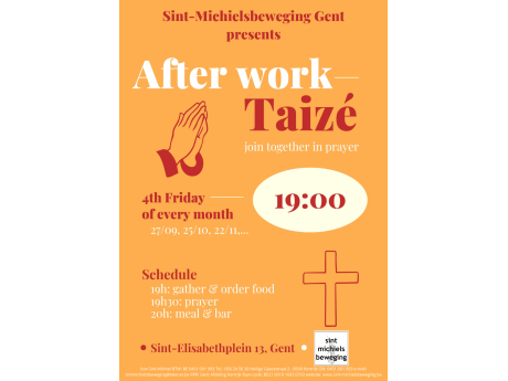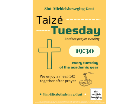 Iedere dinsdagavond is er een Taizé-gebedsavond voor jongeren in het Sint-Michielhuis (Sint-Elisabethplein 13). Om 19u30 is iedereen welkom om mee te zingen en tot rust te komen. Achteraf is er ontmoeting met bijhorende spaghettimaaltijd aan studentikoze prijs. De derde dinsdag van de maand is er gewoonlijk ook Tea-ology voor het Taizé-gebed (een gastspreker komt langs om over een bepaald onderwerp te vertellen met achteraf open gesprek tussen de jongeren en de gastspreker. Met een heerlijk koekje en kopje thee uiteraard!)